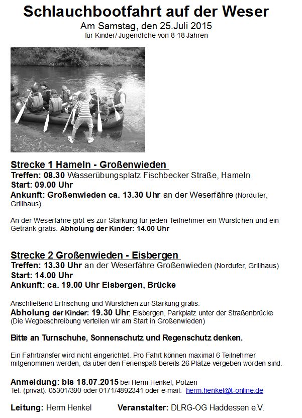 Die Organisatoren der Schlauchbootfahrt am 25.Juli auf der Weser machten es sich nicht leicht: Alles war geplant und vorbereitet, und als es am Freitag, den 24.Juli darum ging die Boote aufzubauen und die Materialien für die Tour auf der Weser von Hameln nach Eisbergen zu verladen, stellte sich die alles beherrschende Frage: Können wir auf Grund der Unwettervorhersage für den nächsten Tag die Tour wirklich verantworten? Bei Gewitter, Regen und Sturm auf die ungeschützte Weser zu gehen, und das mit Kindern ab 8 Jahren, war dem Team zu riskant. Also wurden 25 Kinder der Vormittags-Tour von Hameln nach Großenwieden und 25 Teilnehmern der Nachmittagstour von Großenwieden nach Eisbergen per Telefon abgesagt. Das erste Mal seit über 30 Jahren, in denen die DLRG-Ortsgruppe Haddessen alljährlich im Rahmen der Aktion Ferienpass der Stadt Hess.-Oldendorf eine Schlauchboottour auf der Weser anbietet.