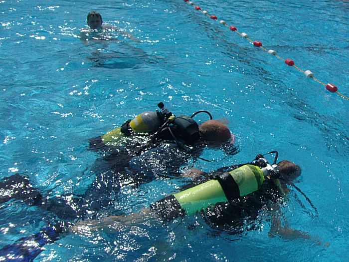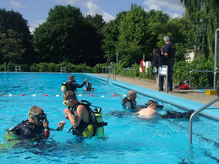Drei Teilnehmer der abgesagten Schlauchboottouren nutzten unser Angebot des Schnuppertauchens im Süntelbad Haddessen am Sonntag Vormittag, den 26.Juli. Unter der Leitung von Steffen Lachnitt, dem Padi Instructor und Leiter der Taucher von Dive Crew Hameln e.V. sollte planmäßig ein Schnuppertauchkurs laufen.