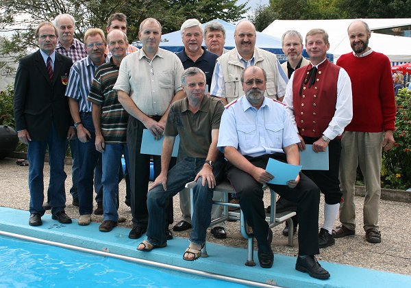 DLRG-Bezirksleiterin Karin Schäfer mahnte ebenfalls, das Süntelbad zu erhalten, in dem 'Nichtschwimmer zu Schwimmern und Schwimmer zu Rettern ausgebildet werden'. Weit über tausend Kinder und Erwachsene haben seit 1968 im Süntelbad schwimmen gelernt, 2008 waren es 52 Kinder. Heinz Beißner, der selbst in diesem Bad zum Schwimmer wurde, las aus einem Brief von Bürgermeister Harald Krüger vor, dass die DLRG Haddessen 'aus der Vereinslandschaft nicht wegzudenken' sei. Neben vielen weiteren Gratulanten betonte Walter Reineke von der Ortswehr Pötzen, das Freibad sei der 'einzige kommunale Treff im Süntel', und 'ohne die DLRG gäbe es kein Süntelbad'. Mit einem Lied überbrachte die Kindernachmittagsgruppe ihre Glückwünsche. Auch langjährige Gäste auf dem Zeltplatz wie die Motorradfreunde am Ith und eine Pfadfindergruppe aus Wuppertal gratulierten. Von den 35 Gründungsmitgliedern der DLRG Haddessen konnten 14 eine Urkunde in Empfang nehmen, darunter auch Herm Henkel.