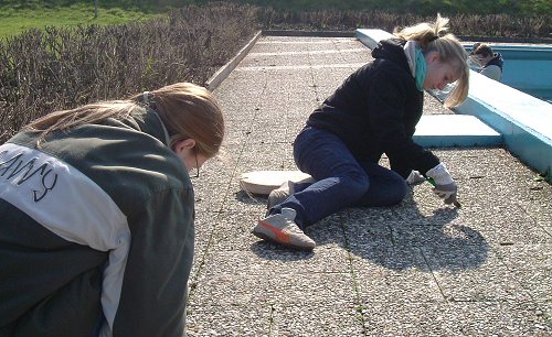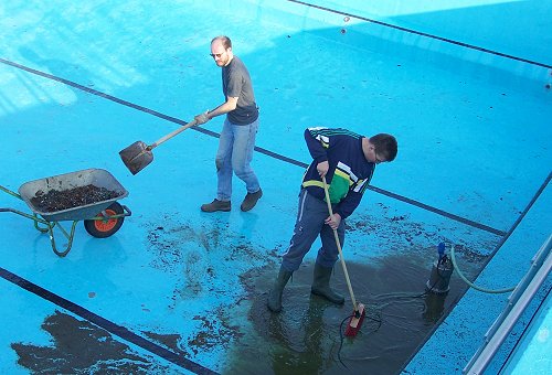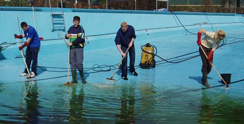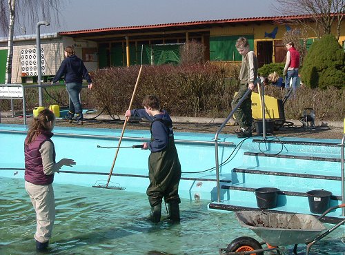 gemeinsam arbeiten, um das Schwimmbad wieder für die Sommersaison herzurichten,