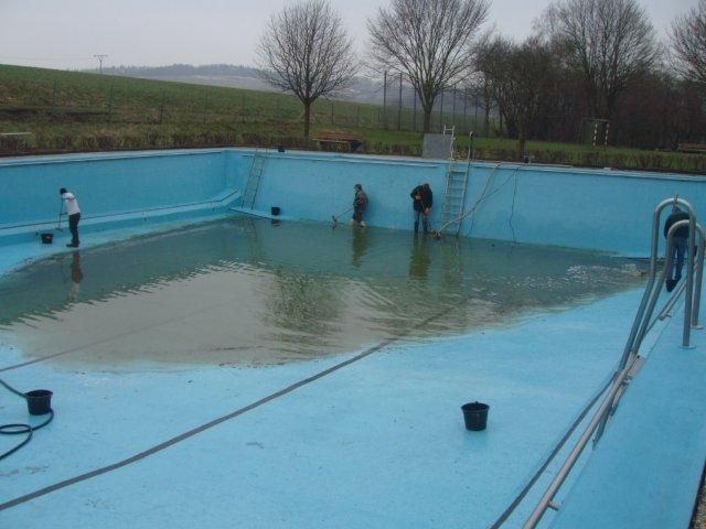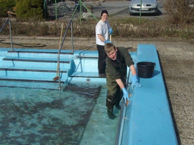 haben das Schwimmbecken geschrubbt und mit dem Hochdruckreiniger gereinigt,