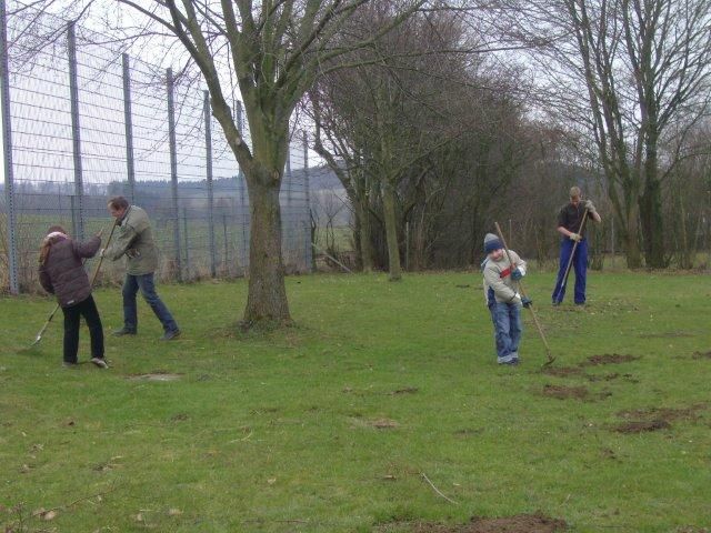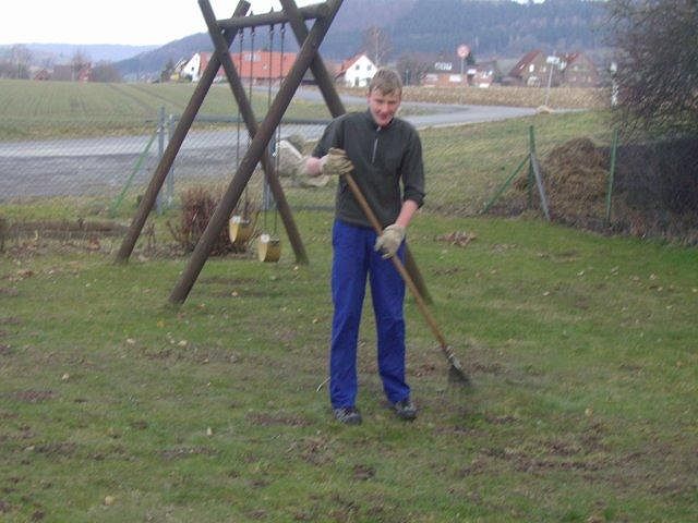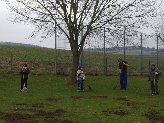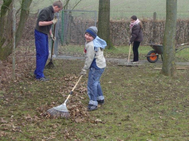 waren unermüdlich dabei, um die Rasenflächen abzuharken,