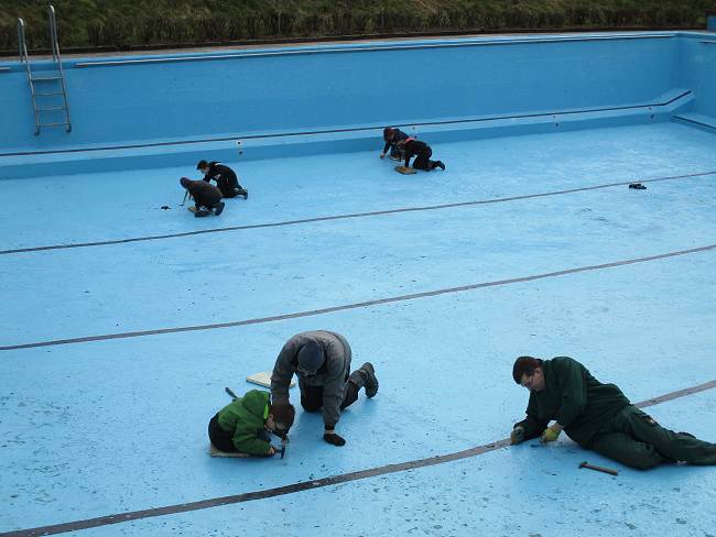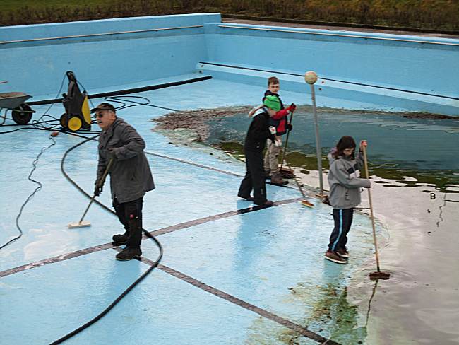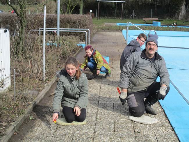 Mit dem Workcamp ist der Grundstein für die Herrichtung des Freibades bis zu Saisonbeginn am Sonntag, den 22. Mai 2016 gelegt worden. In den nächsten Wochen werden neue Betonplatten an der Tischtennisplatte verlegt werden, in dem Schwimmbecken und Planschbecken müssen wiederholt alte Farbe abgespachtelt und die Becken müssen gestrichen werden. Wenn der Wettergott mitspielt, werden die anstehenden Arbeiten auch zu schaffen sein. Alle Betroffenen sind da optimistisch.