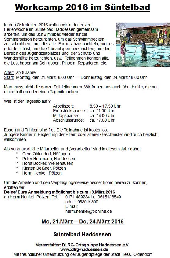Für 4 Tage haben sich 20 Kinder, Jugendliche und Erwachsene im Süntelbad Haddessen eingefunden, um gemeinsam das Süntelbad Haddessen für die Saison 2016 herzurichten. Zu den Arbeiten gehören das alte Schwimmbadwasser ablassen, Wände und Bodenflächen schruppen, lose Farbe abspachteln, Rasenflächen abharken, Beete jäten, Plattenwege jäten, Aufsichtsraum und Umkleidekabinen gründlich reinigen, die Schutz- und Wanderhütte (Grillhütte) herrichten, den Lagerfeuerplatz mit den Anschlussweg zu jäten und instand zu setzen, Splitt auf dem Parkplatz zu erneuern und die Tischtennisplatte und die Tore für den neuen Anstrich abzuschleifen.