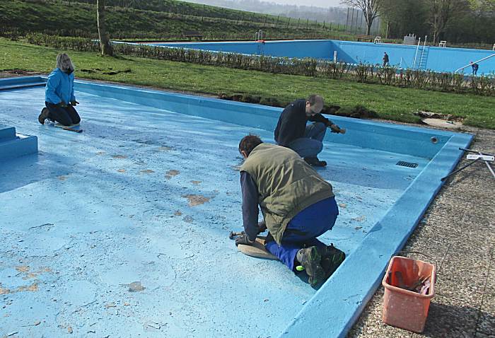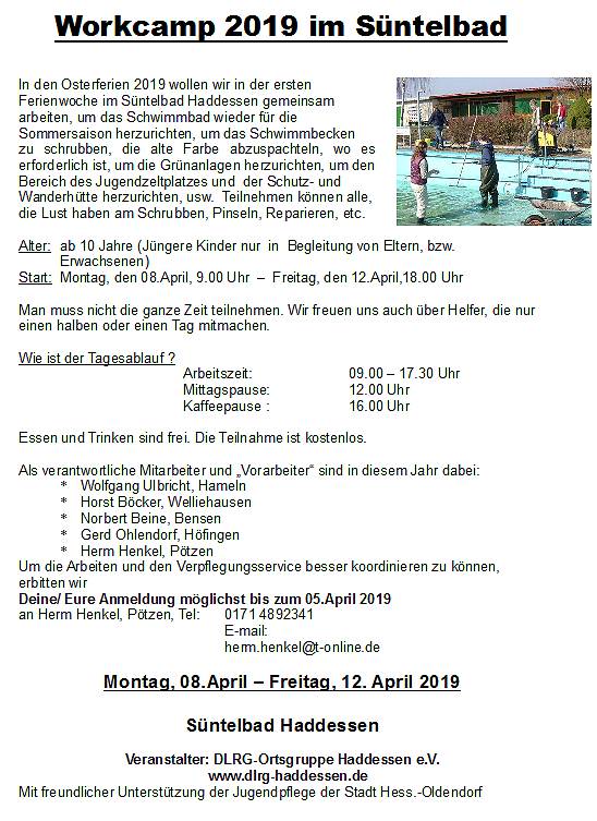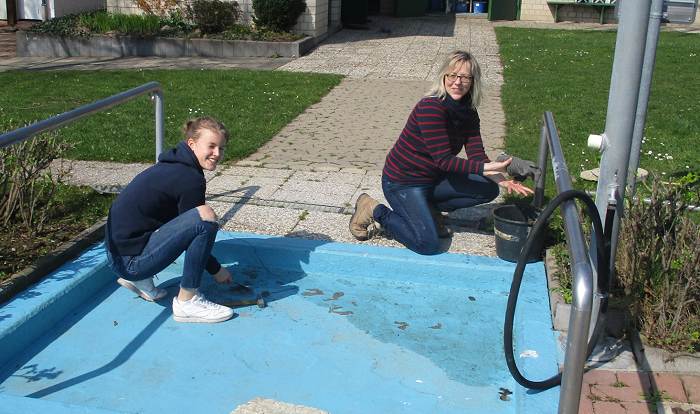 Für 5 Tage haben sich 10 Kinder und Jugendliche und 10 Erwachsene im Süntelbad Haddessen eingefunden, um gemeinsam das Süntelbad Haddessen für die Saison 2019 herzurichten. Da in diesem Jahr das traditionelle Workcamp (immer in der ersten Ferienwoche, bzw. in der Woche vor Ostern) auf Grund des späten Ostertermins erst vom 08.-12. April stattfinden konnte, waren wichtige Arbeiten wie das alte Schwimmbadwasser ablassen, Wände und Bodenflächen schruppen, lose Farbe abspachteln und das Schwimmbecken, das Planschbecken und die Außenduschen zu streichen, bereits in den Samstagen im März und Anfang April erledigt worden. Aber viele Arbeiten mussten noch von den fleißigen Helfern ausgeführt werden: Rasenflächen abharken, Beete jäten, Plattenwege jäten, Aufsichtsraum und Umkleidekabinen gründlich reinigen, die Schutz- und Wanderhütte ( Grillhütte) herrichten, den Lagerfeuerplatz mit den Anschlusswegen jäten und instand setzen, Splitt auf dem Parkplatz erneuern, den Umwälzanlagenraum aufräumen und ausfegen, Plattenwege kärchern, Fenster des Sanitärgebäudes streichen, Kiosk und Duschen streichen und die Reste der gefällten Silberweide aufladen, etc.