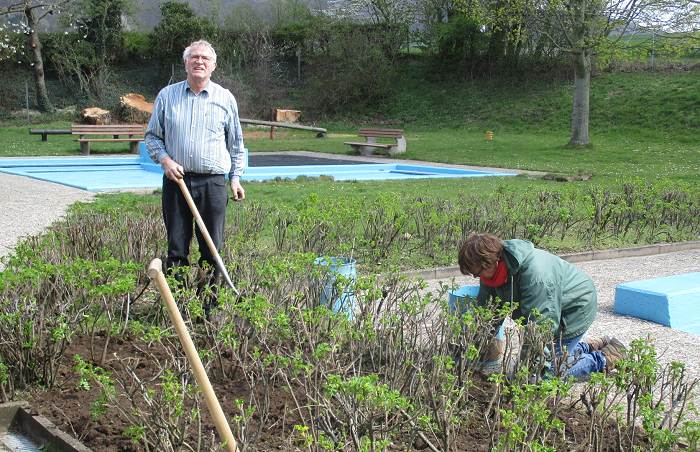 Mit dem Workcamp ist der Grundstein für die Herrichtung des Freibades bis zu Saisonbeginn am Sonntag, den 12.Mai 2019 gelegt worden. In den nächsten Wochen werden noch die Plattenwege und die Heckenbereiche weiter gejätet, Rasen neu eingesät, Markierungen auf den Beckenrändern erneuert, die Sitzbänke im Schwimmbadbereich und rund um den Lagerfeuerplatz gestrichen. Ab Ende April soll das Schwimmbecken mit Wasser gefüllt werden und am 30. April wird die Umwälzanlage hochgefahren. Wenn der Wettergott mitspielt, werden die anstehenden Arbeiten auch zu schaffen sein. Alle Betroffenen sind da optimistisch.
