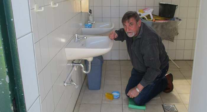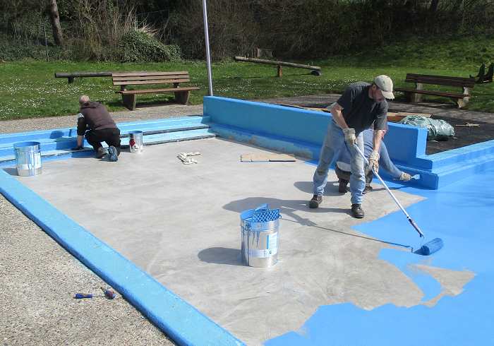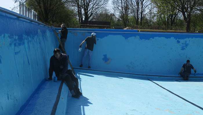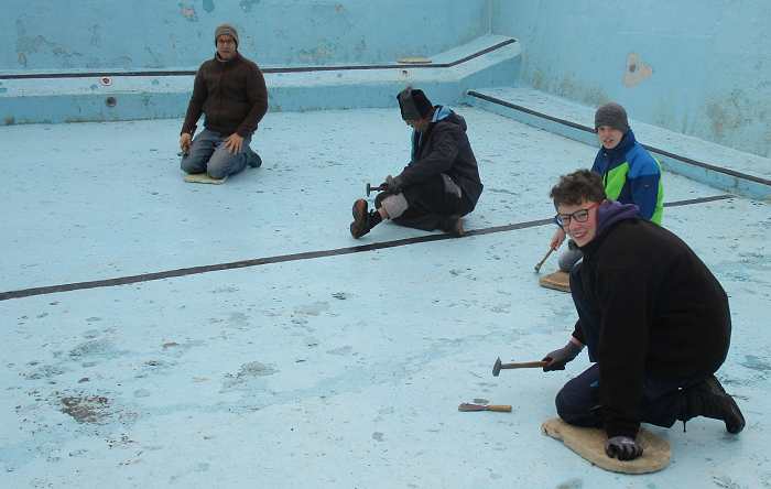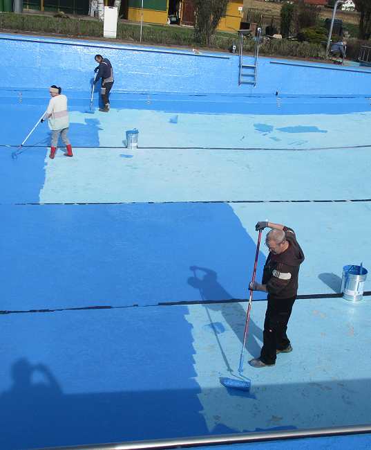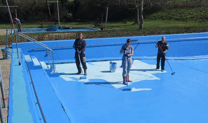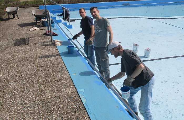 Das Abspachteln der losen Farbe von den Betonflächen wurde mit Beginn des Workcamps wieder aufgenommen und fortgesetzt. Ferner wurden die Grünflächen abgeharkt, gemäht und die Beete entkrautet, Farben und Chemikalien wurden aus dem frostsicheren Winterquartier in die Sommerlagerräume umgelagert, das Sanitärgebäude gereinigt, der Aufsichtsraum einem Frühjahrsputz unterzogen. Nachdem auch die Fußballtore aufgebaut worden waren und ferner der Bereich der Schutz- und Wanderhütte und des Lagerfeuerplatzes hergerichet worden war, ging es wieder ans Schwimmbecken, um mit dem Streichen mit neuer Betonfarbe zu beginnen. Doch das Wetter wurde immer schlechter: Richtiges kaltes Aprilwetter mit Hagel und Regen setzte ein, sodass am Donnerstag, dem 7.April und Freitag, dem 8.April das workcamp unterbrochen werden musste und am Montag, den 11. und Dienstag, den 12.April beim strahlendem Sonnenschein fortgesetzt werden konnte. Nach nochmaligem Spachteln wurden an an den beiden Tagen das große Schwimbbecken, das Planschbecken und die beiden Außenduschen gestrichen.