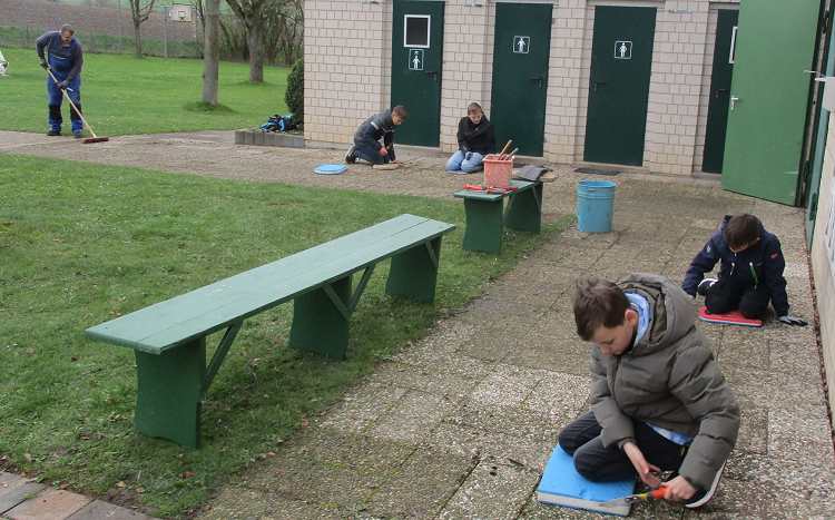 Mit Start des Workcamps konnte damit begonnen werden, die lose Farbe von den Betonwänden abzuspachteln. Ferner wurden die Grünflächen abgeharkt, der Parkplatz gejätet, Farben und Chemikalien wurden aus dem frostsicheren Winterquartier in die Sommerlagerräume umgelagert und Plattenwege gekärchert und die Mülltonnen auf dem Schwimmbadgelände verteilt. Auch konnten der Bereich der Schutz- und Wanderhütte und des Lagerfeuerplatzes hergerichet werden.