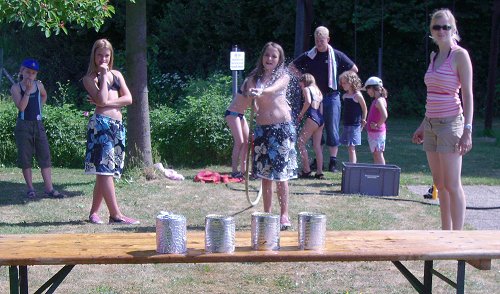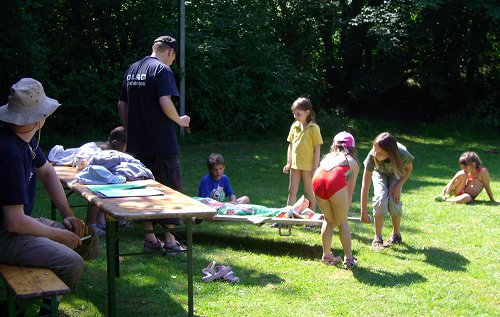 Das morgendliche Wecken mit den Topfdeckeln war einigen fremd im Ohr, aber tat seine Wirkung. Vormittags konnte jeder beim Stationsspiel Körper und Geist trainieren und Spaß machte es obendrein. Aufgrund der großen Hitze von 30 Grad im Schatten und ersten Schwächeanzeichen bei den Kindern wurde ein Gang zurück geschaltet. Die Pause wurde zum aufräumen und sauber machen genutzt und zum vorbereiten des abschließenden Spielfestes. Hier waren die Wasserspiele die größten Renner.