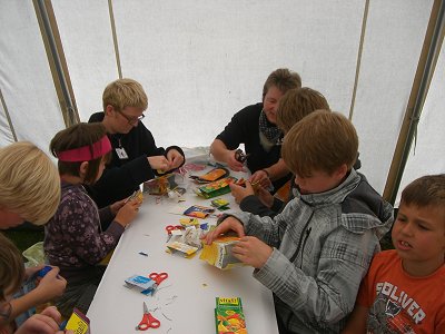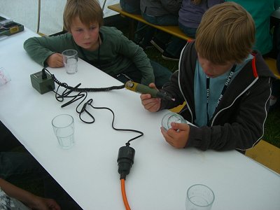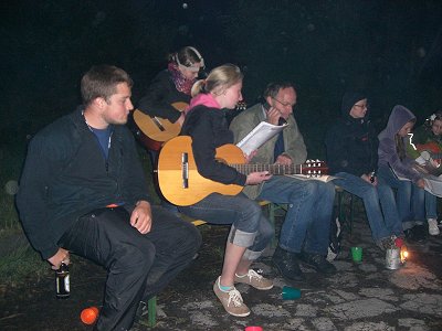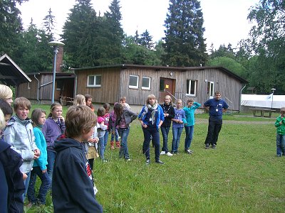 Nach Kennenlernrunde, Rundgang und erster Mittagsmalzeit wurden Geldbörsen und Puppen gebastelt und Glasschleifen erfreutes manches Kinderherz. Völkerball, Fußball und Hüpfburg sorgten für Bewegung und die abendliche Wanderung nach dem plötzlichen kurzem Gewitter stimmte auf das Lagerfeuer ein. Gitarrenbegleitung, Gesang und Kartoffeln aus dem Feuer rundeten diesen kühlen, aber schönen Abend ab. Eine tolle Atmosphäre.
