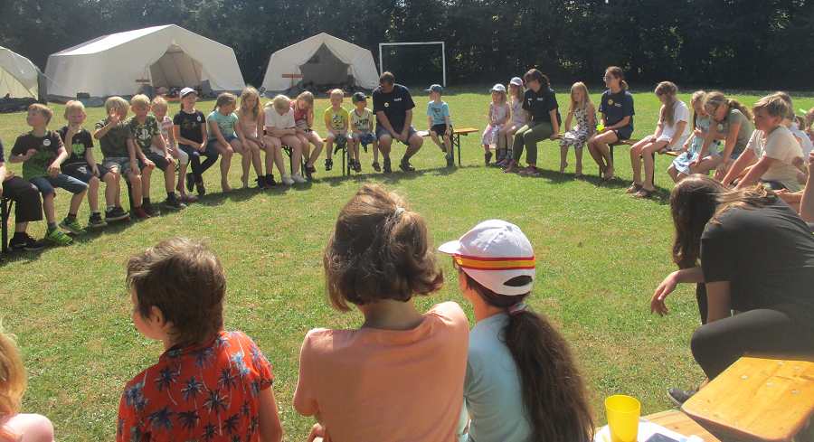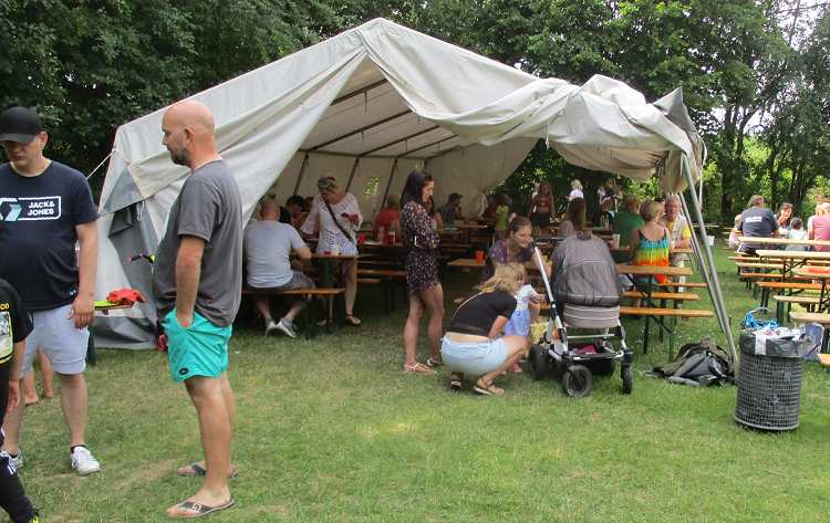 Aber was war? Das gute trockene Wetter blieb uns den ganzen Tag wider Erwarten erhalten und so konnten die Teilnehmer noch an einem Völkerballspiel und an diversen Wehrwolfspielen teilnehmen oder sich einfach ausruhen. Gegen 16.00 Uhr trafen Eltern, Geschwister, Angehörige und Freunde der Familien ein , brachten Kuchen und Getränke und Picknickgeschirr mit und in und rund um das große Aufenthaltszelt versammelten sich die die Kinder und Betreuer des Kinderzeltlagers und die Besucher und manches Erlebnis konnte von den Kindern und Betreuern berichtet werden.