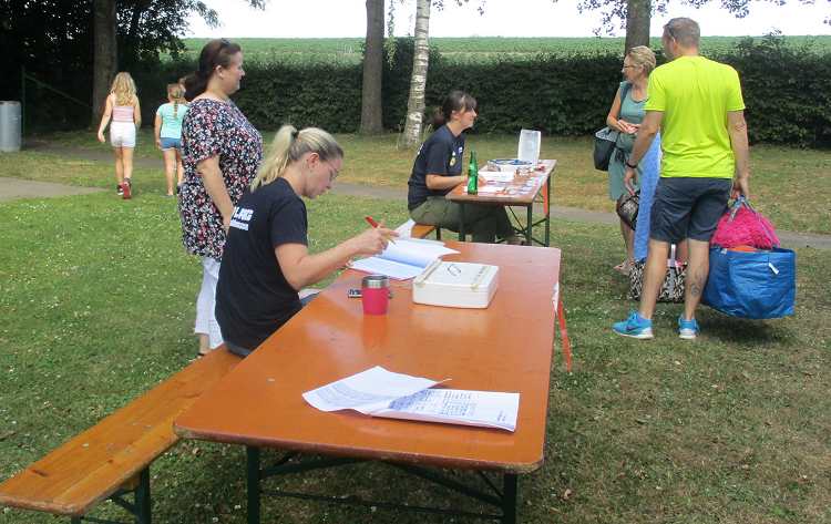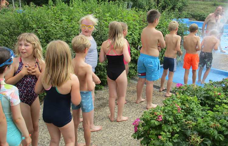 Doch erst standen am Samstagvormittag Anmeldung, Zeltverteilung und erstes Kennenlernen auf dem Programm. Ein Rundgang über das weitläufige Gelände bildete den Abschluss vor dem Mittagessen, denn schließlich sollte und musste jedes Kind über die Möglichkeiten, aber auch über die Grenzen informiert werden. Nachdem sich alle gestärkt hatten, war Mittagspause vor dem heiß begehrten Baden und Toben im schönen Süntelbad Haddessen angesagt. Doch dann sollte es endlich los gehen: Nach kurzer Einweisung stürmten alle Kinder das Schwimmbecken, sogar die Nichtschwimmer mit roter Badekappe in das Nichtschwimmerbecken - denn Sicherheit geht vor Spaßfaktor. Besonders viel Freunde machten die Rutsche, das Autoreifen- und Maurerkubel - Karussel und die diversen Badematten und Schwimmnudeln.