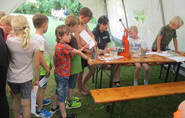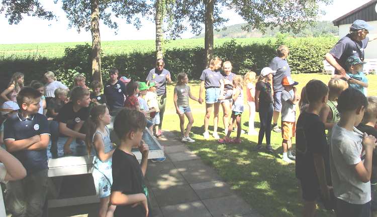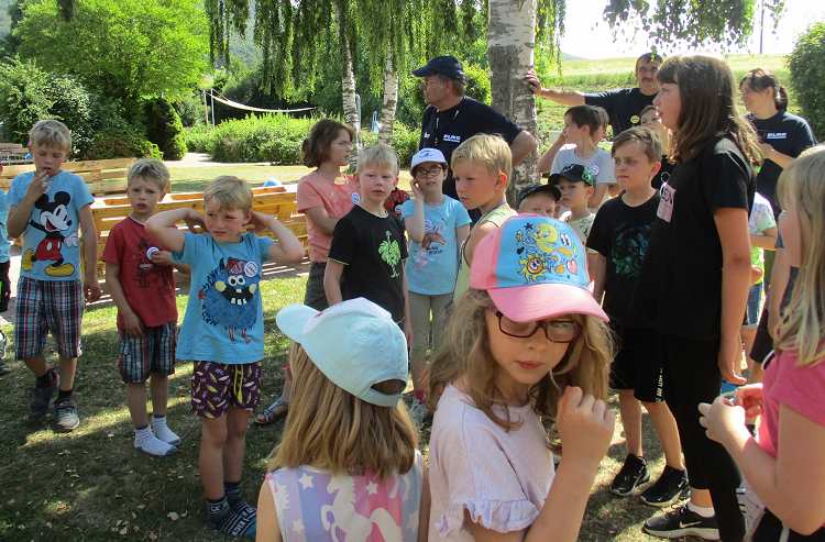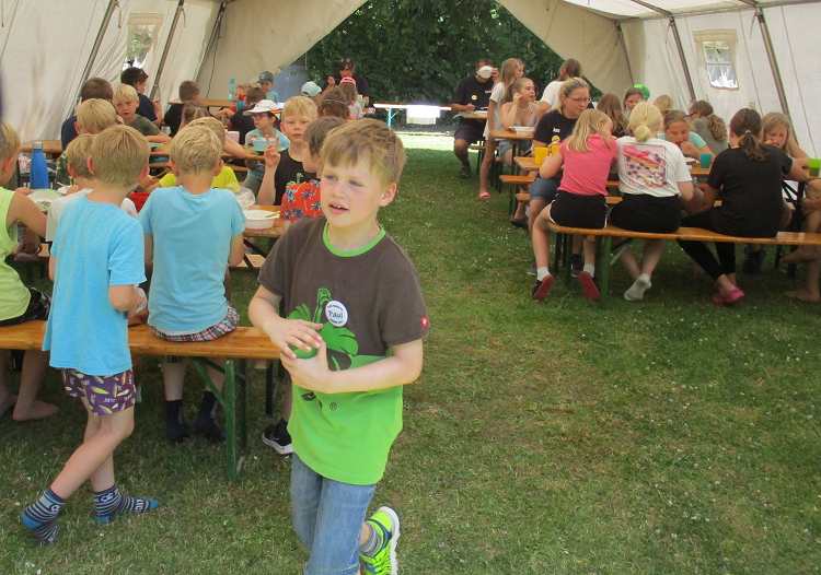 Ein fröhlicher Trompetensolo weckte die Teilnehmer des DLRG-Kinderzeltlagers am Sonntagmorgen und wieder drohte der Wetterbericht mit Regen, Hagel, Gewitter, aber es sollte trocken bleiben. Am Vormittag war das seit vielen Jahren in Betreuerkreisen bekannte 'Chaos-Spiel' angesagt. In 7 Gruppen, die per Los ermittelt wurden, mussten unterschiedliche Aufgaben gelöst werden. Nicht so einfach bei dem schwülen Wetter die jeweiligen Gruppen bis zum Sieg oder Ende auf Feld 40 auf dem Spielbrett zu motivieren. Aber alle haben es geschafft. Kein Wunder, das nach diesen Gruppenwettbewerben das Mittagessen besonders gut schmeckte.