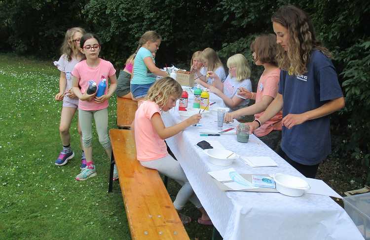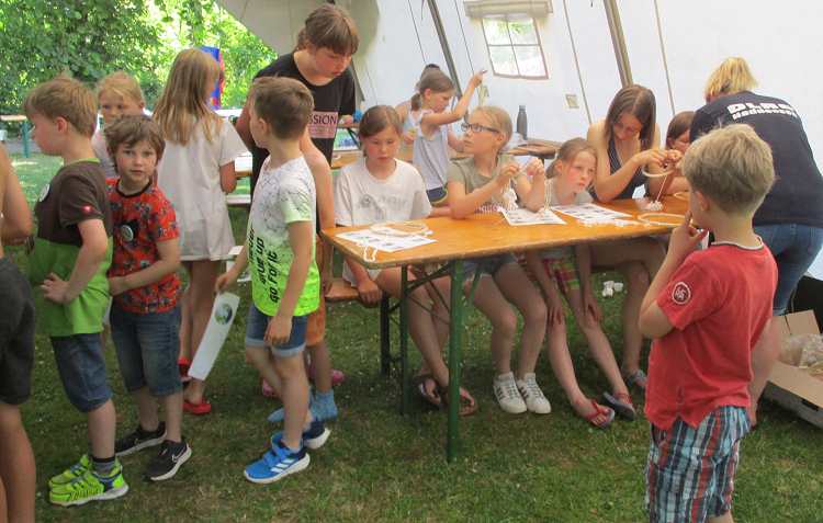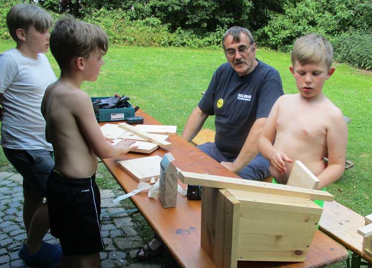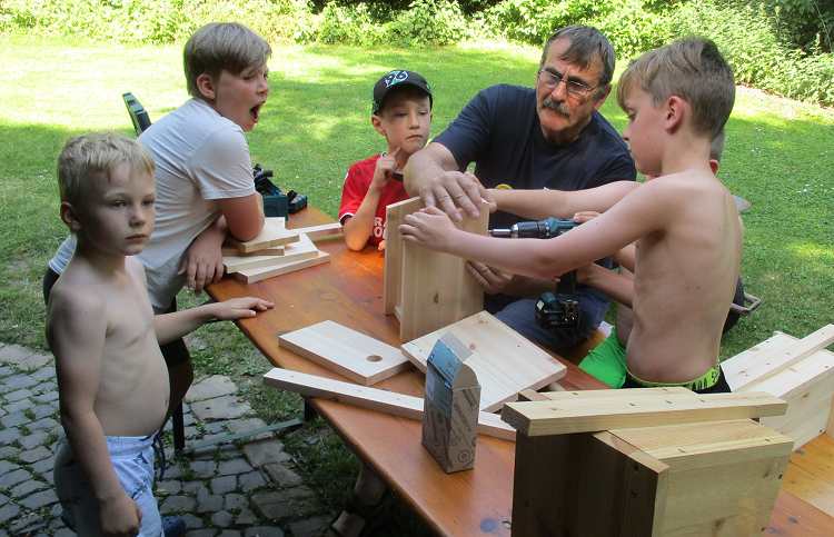 Nach Erholungspause an der Kaffeetafel durften sich die Kinder unter Anleitung der Betreuer für verschiedene Bastelangebote entscheiden: Herstellen von Traumfängern, die mit viel Phantasie gebastelt wurden, bemalen von kleinen Leinenbildern, Erstellen von Button und Armbändern und der Zusammenbau von Nistkästen. Die Kinder waren mit viel Eifer und Freude bei der Sache und manch handwerkliche Fähigkeit konnte durch Unterstützung vermittelt, bzw. sogar vertieft werden.