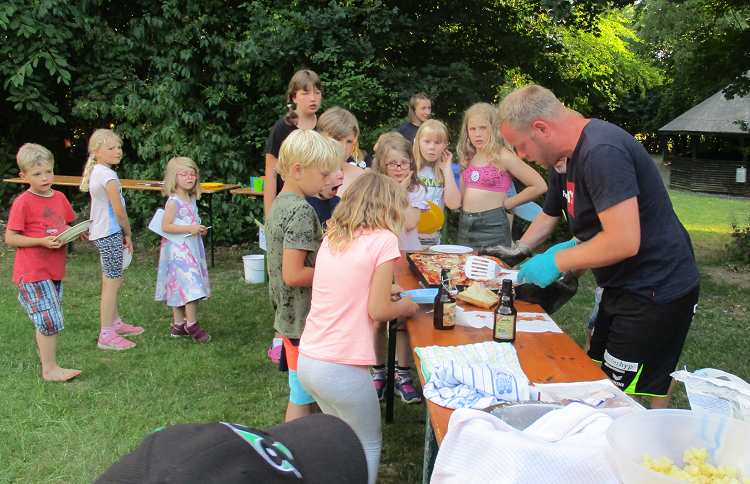 Zum Abendessen gab es selbstgebackene Pizza, Dazu hatte Florian Hermann einen selbstgebauten Pizzaofen neben dem großen Ess- und Aufenthaltszelt aufgestellt, angeheizt und die Pizza wurde zünftig im Holzofen gebacken. Das schmeckte natürlich allen super und war ein echtes Highlight, Die Abendtour führte die Teilis zum Waldrand an den Süntel und manch einer erlebte die Abendstunde offensichtlich zum ersten Mal mit allen Sinnen. Die Runde am Lagerfeuer mit Gesang und Tanzvorführungen und süßen Machmallos auf den Stöcken über den Feuerschalen beendete den Tag.
