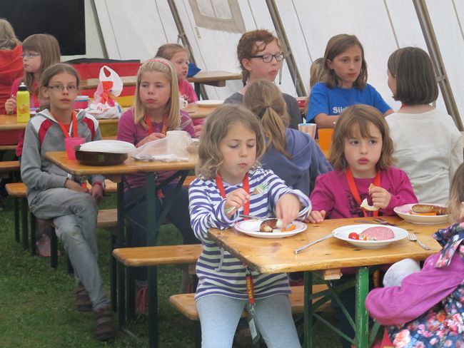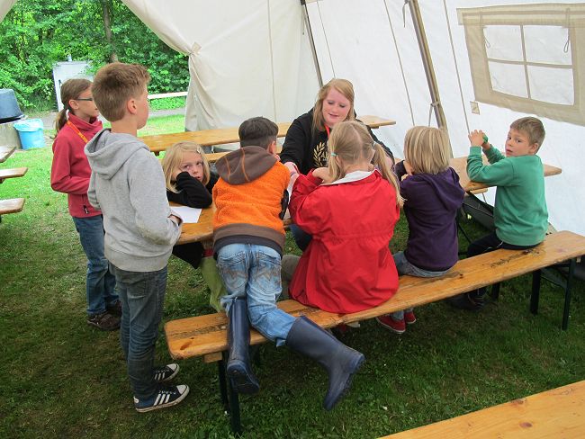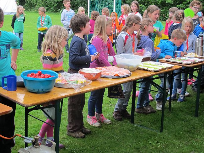 Der Trompeter vom Dienst weckte am Sonntag die Meute, aber die meisten tobten schon herum und erwarteten das Küchenteam mit dem Frühstück. Birgit und Jörg versorten alle ganz hervorragend an dem Wochenende. Am Sonntagvormittag war das Stationsspiel ein weiterer Höhepunkt. In 6 Gruppen eingeteilt mussten 6 Stationsaufgaben bewältigt werden.