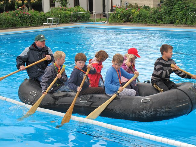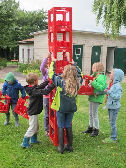 Aber auch alle zusammen starteten nach der offiziellen Begrüßung und einem Rundgang mit einem gemeinsamen Völkerballspiel. Nach dem ersten Mittagsessen gab es viel zu Basteln: Unter der Anleitung der Betreuer konnten die Kinder Kraken, Jonglierbälle und Schiffe bauen. Holz hatte die Firma Holz-Weber, Höfingen, gespendet und die Schiffskörper hatte Jörg Diekmann aus Pötzen noch einmal zugeschnitten, sodass die Kids mit den weiteren Arbeiten sofort loslegen konnten: da wurde gehämmert, gebohrt, gesägt, was das Zeug hielt. Anschließend wurden die Schiffe zum Stapellauf in das Planschbecken gebracht und getestet. Alle Schiffe waren schwimmfähig. Toll!