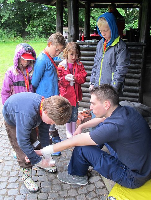 Das gelang allen ganz hervorragend. Die 1. Hilfe Station wurde vom DRK Hameln-Pyrmont von den Herren Meyer und Hundertmark professionell übernommen. Weitere Aufgaben waren Tastkästen bestimmen, Fragebogen ausfüllen, Torwandschiessen, Kisten stapeln, Schlauchbootfahren.